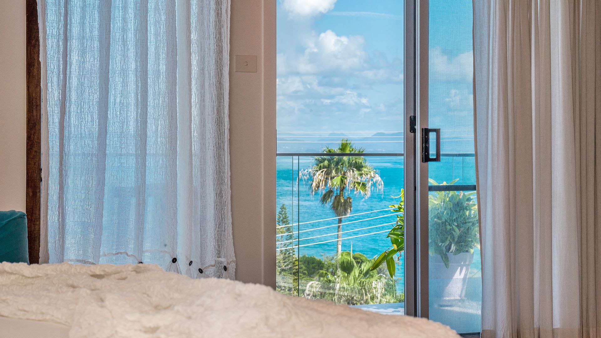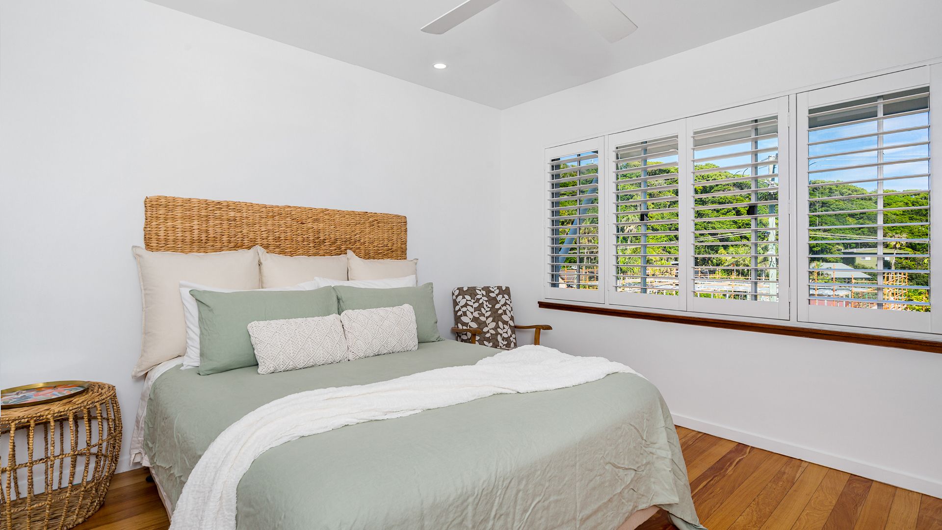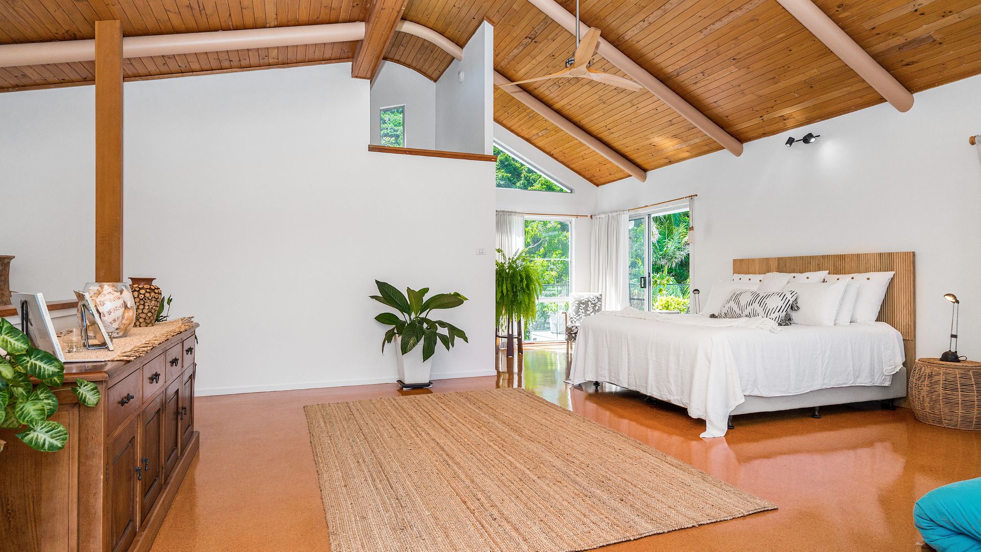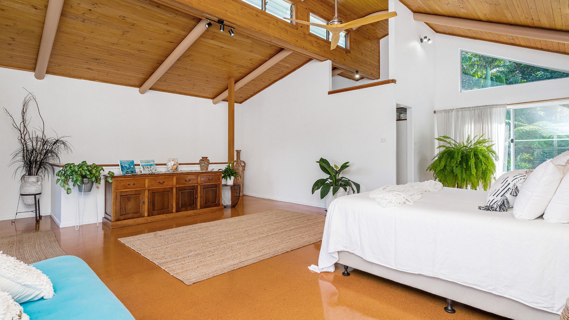 The master bedroom is situated on the entire top floor and features a King size bed with an en suite bathroom, TV, and high ceiling. A private, wrap-around deck surrounds this space and offers ocean and hinterland views.
