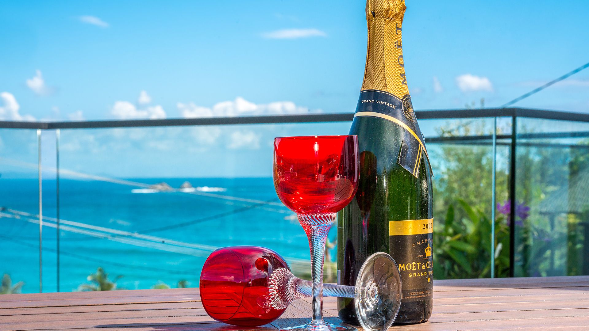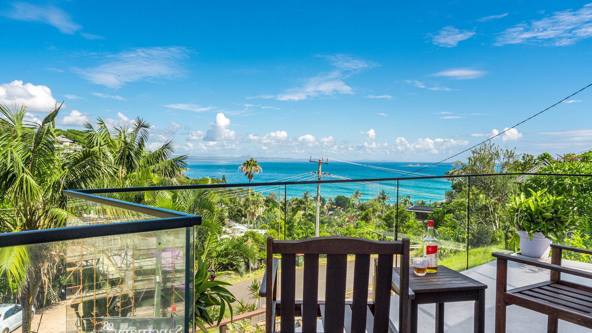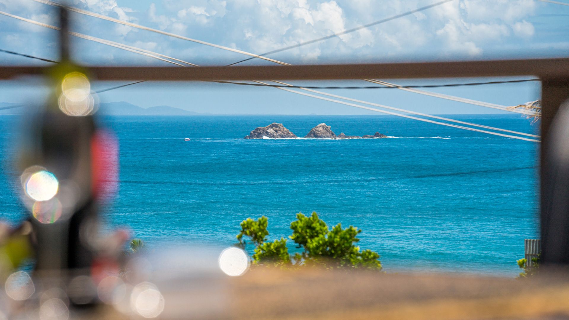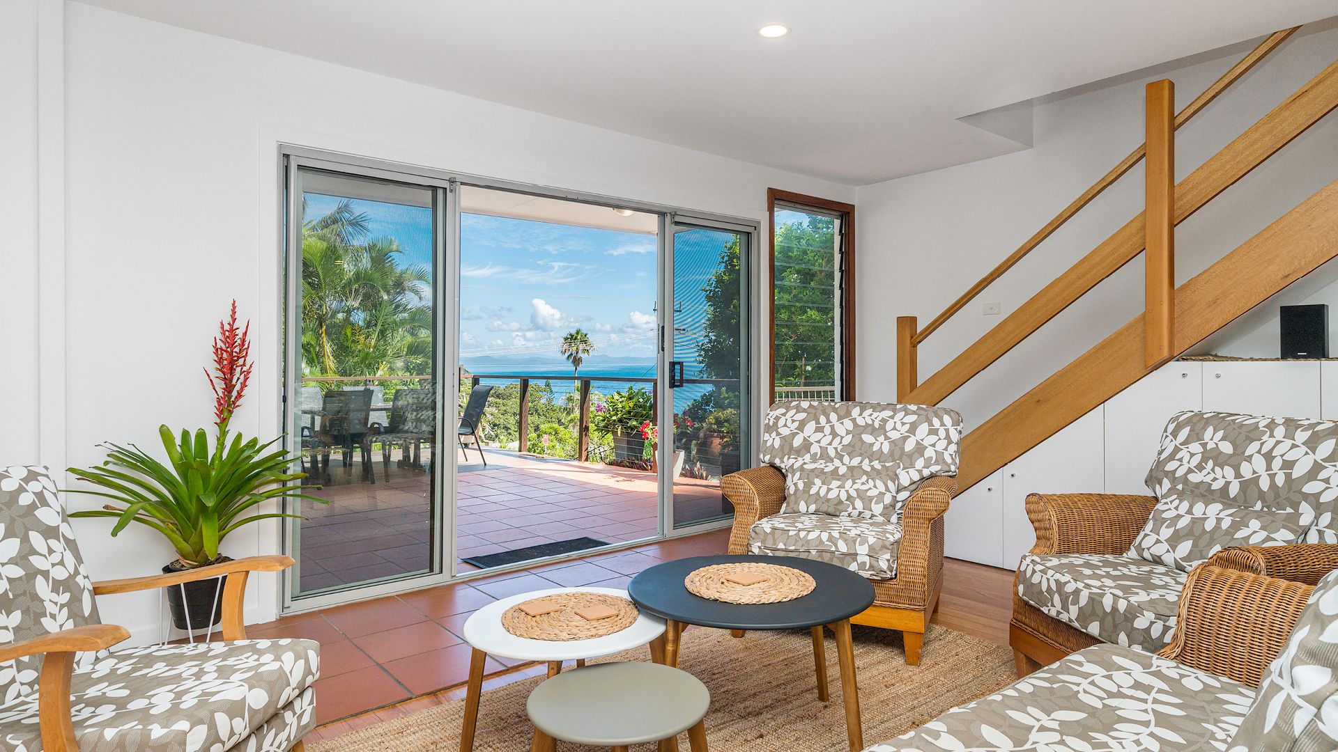 The master bedroom is situated on the entire top floor and features a King size bed with an en suite bathroom, TV, and high ceiling. A private, wrap-around deck surrounds this space and offers ocean and hinterland views.