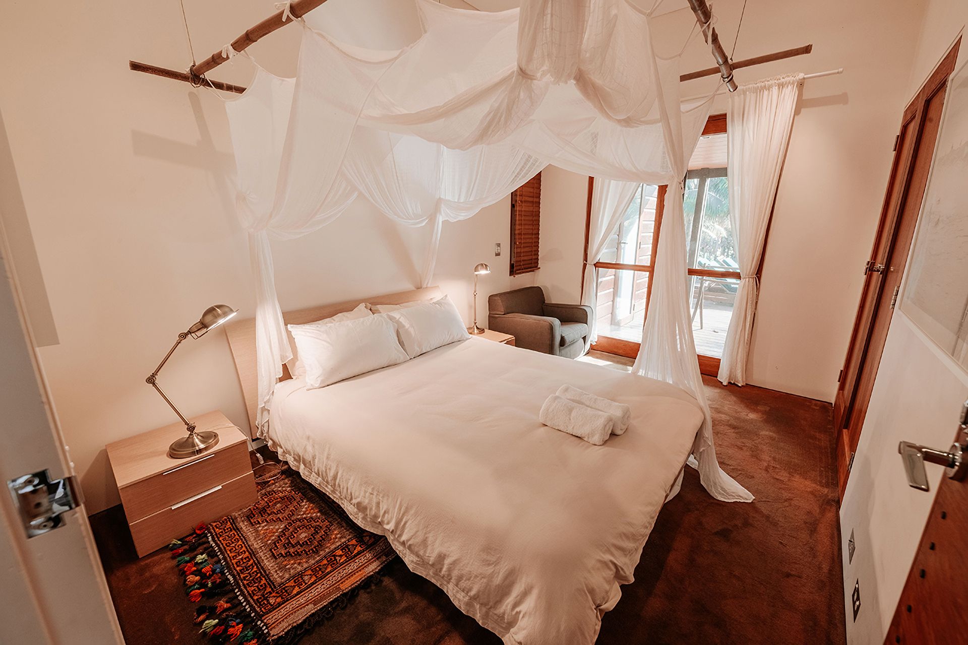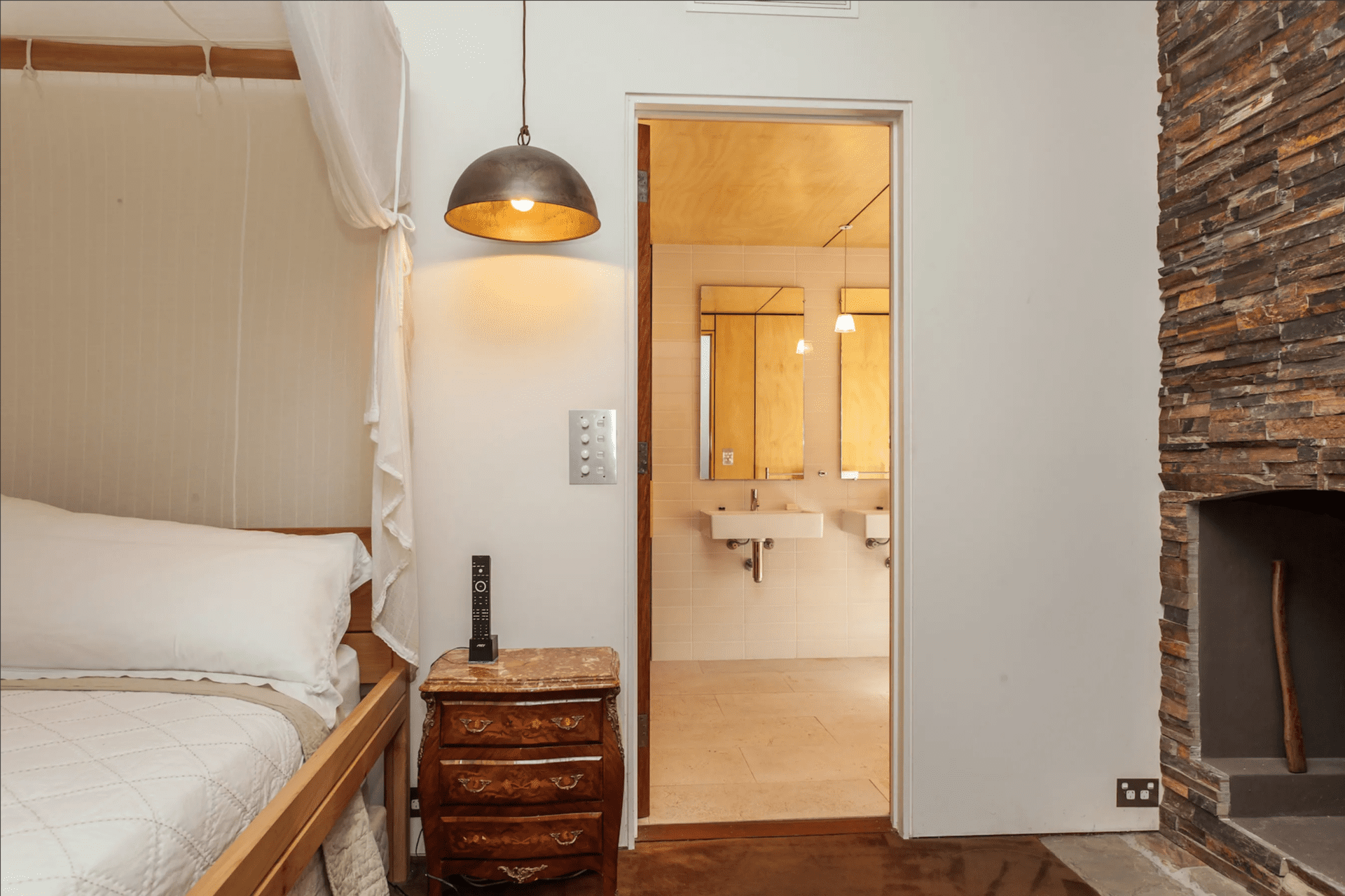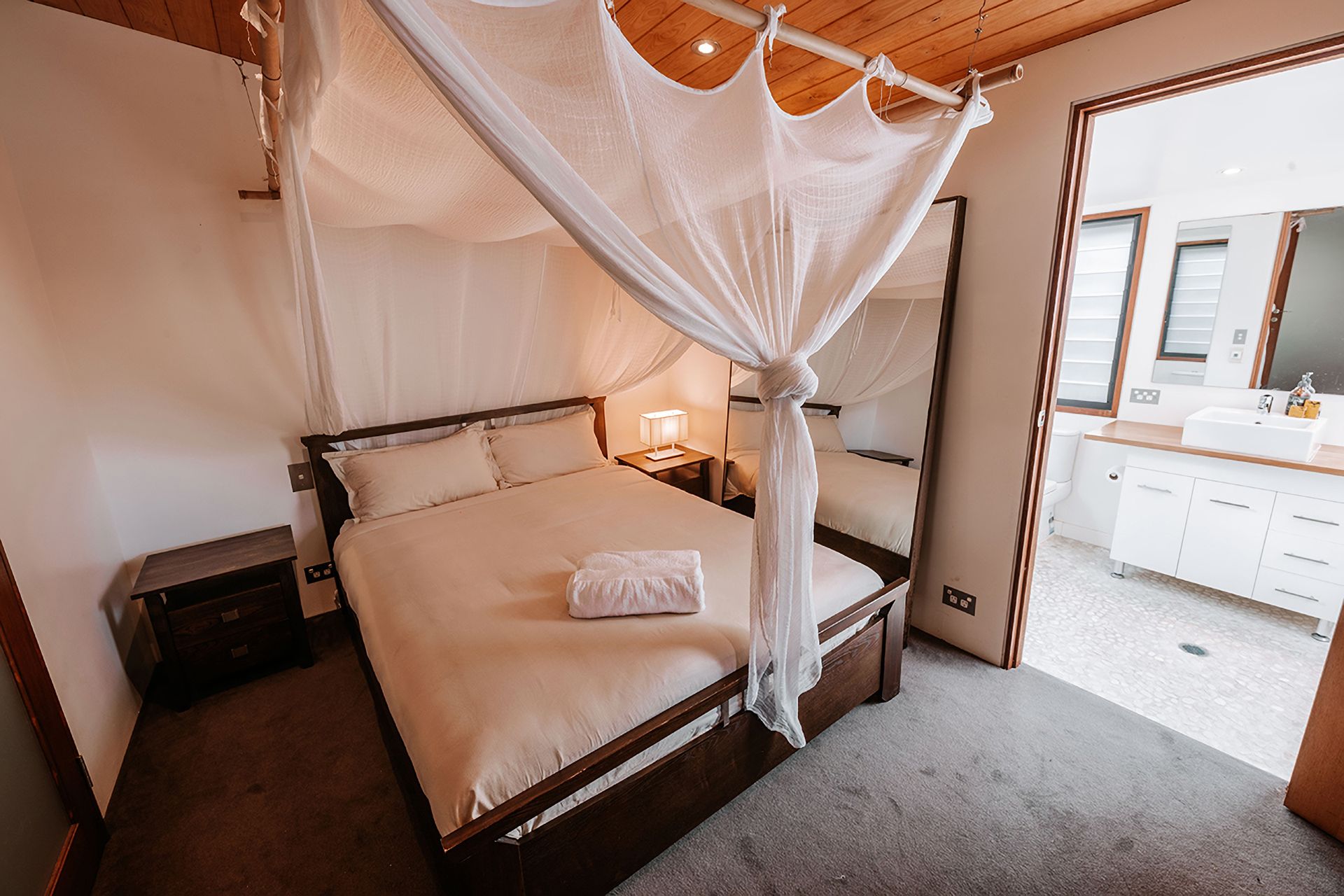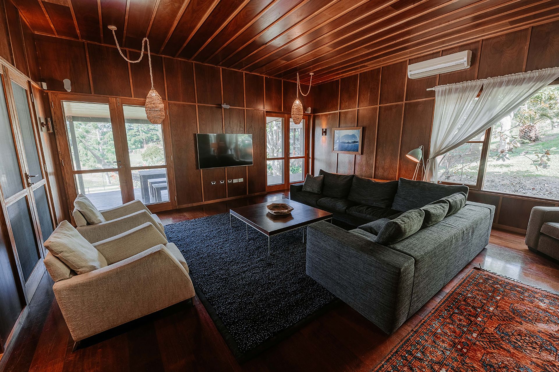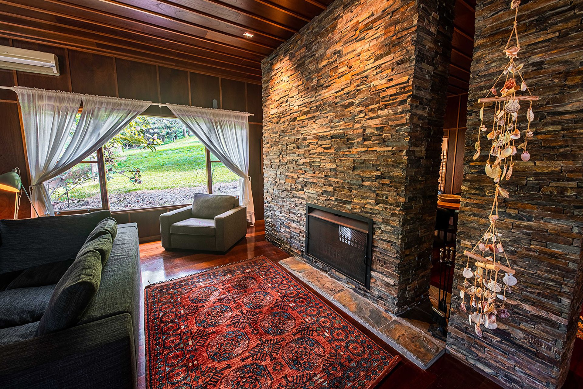 The main house has been built predominantly with dark woods and is tastefully furnished with fabulous artwork throughout. The master bedroom with king bed & ensuite and another 4 spacious Queen bedrooms which share 2 bathrooms with 2 of the bedrooms interconnecting. There are 2 different living areas in the main house including a lounge room with an enormous open fireplace. There is a 6 seater cinema as well as a separate dining room which overlooks the gardens and pool area. The kitchen is well-appointed and fully equipped.