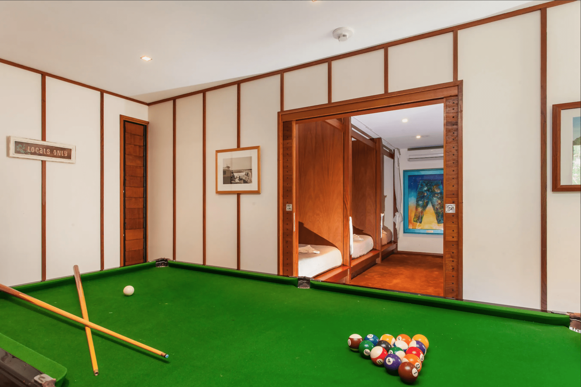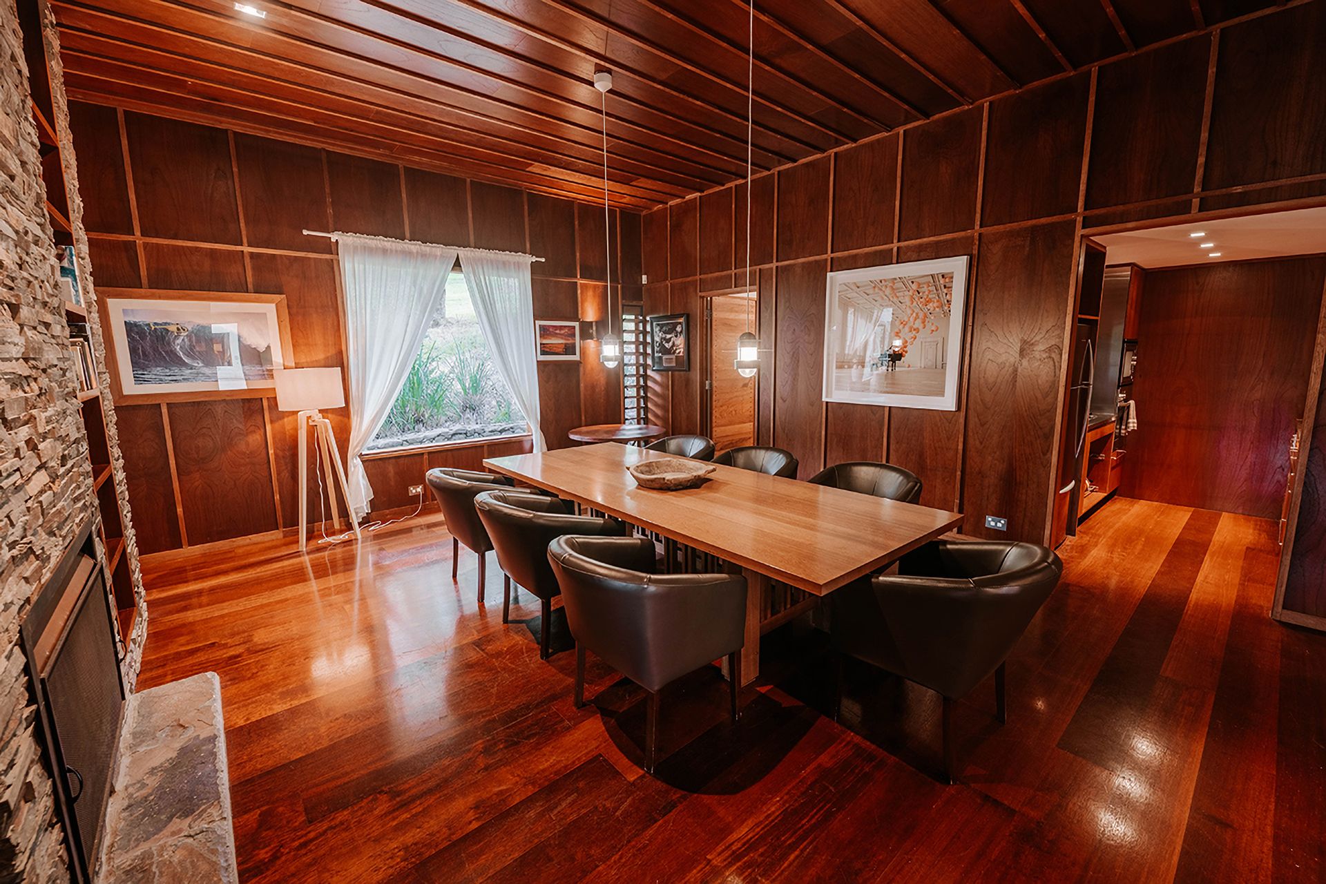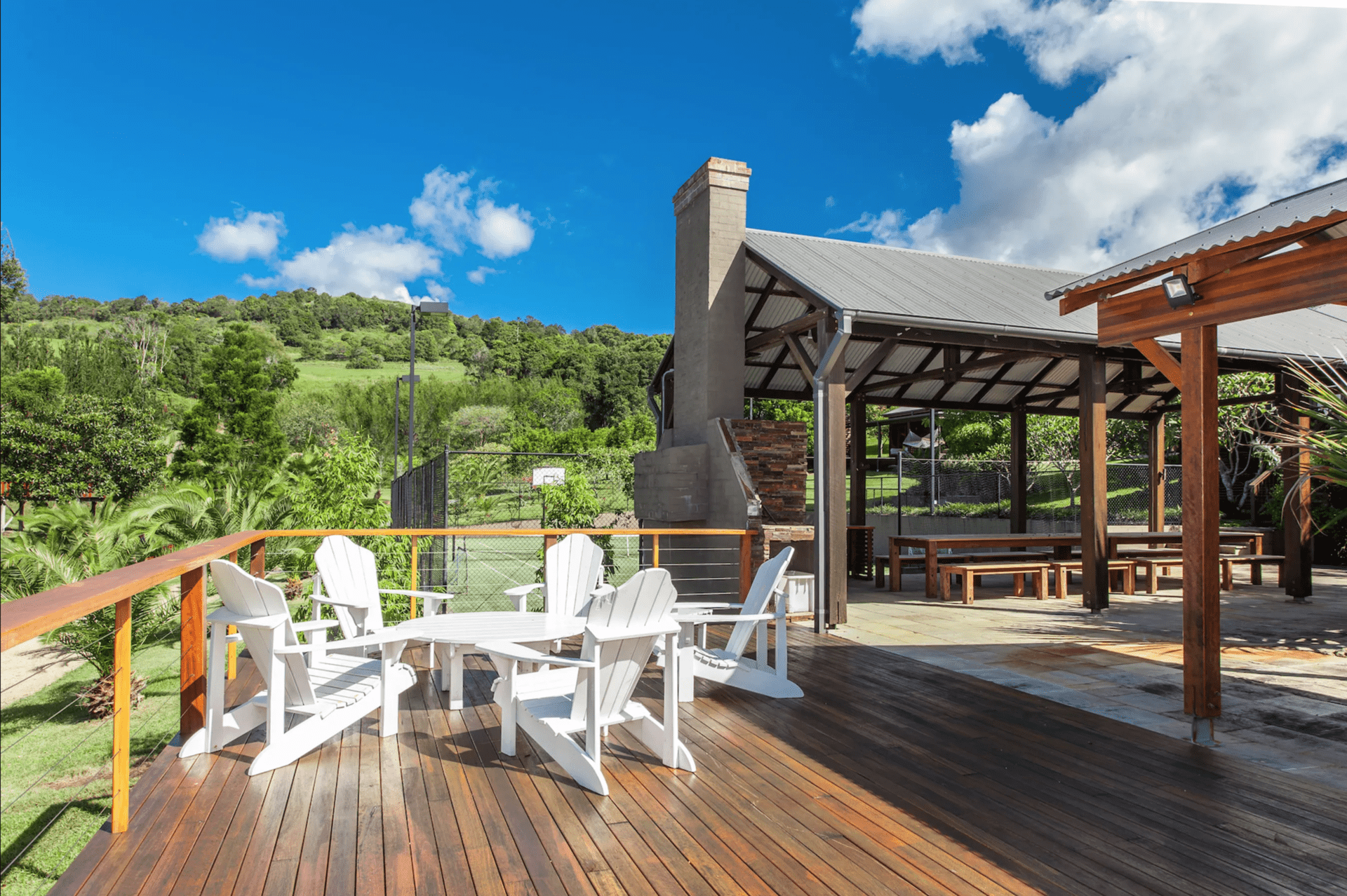 The second wing of the home is joined to the main house by an undercover wooden walkway. This space has a large comfortable living area with a double-sided fireplace, pool table, separate dining area, kitchen, a Queen en-suite bedroom, and a Japanese-style bunk room with 6 double beds - perfect for the kids!