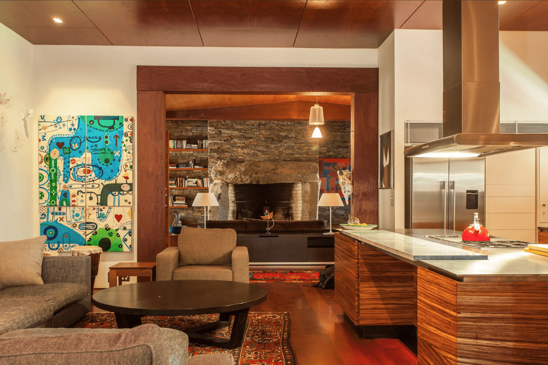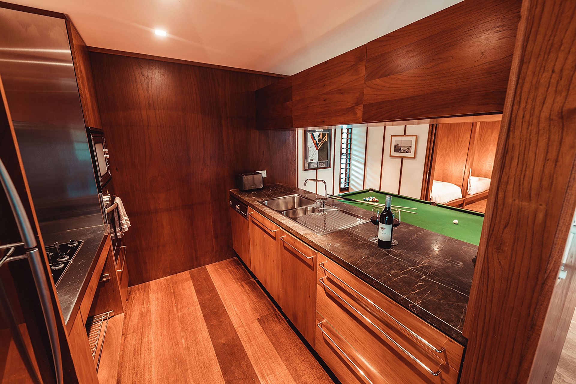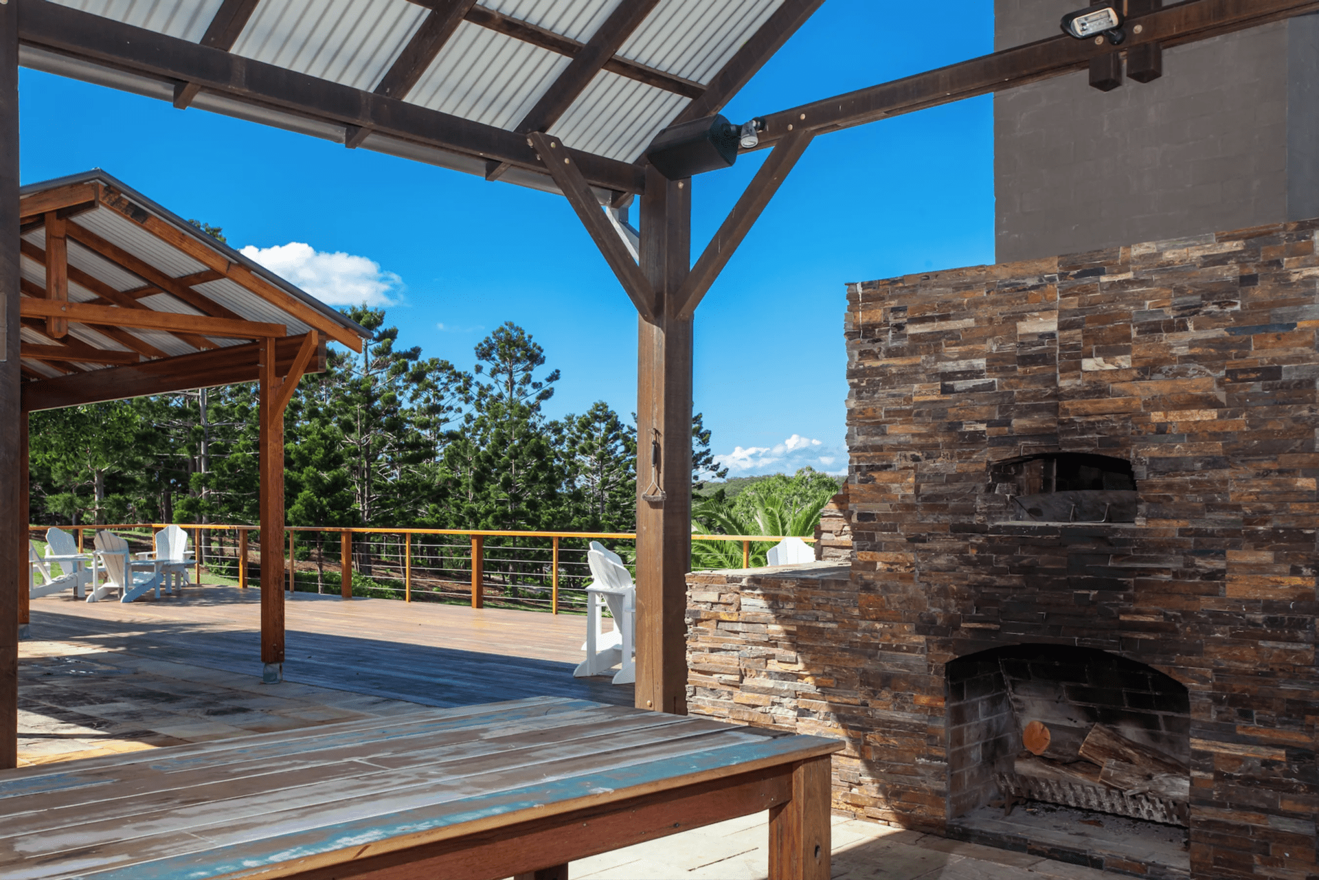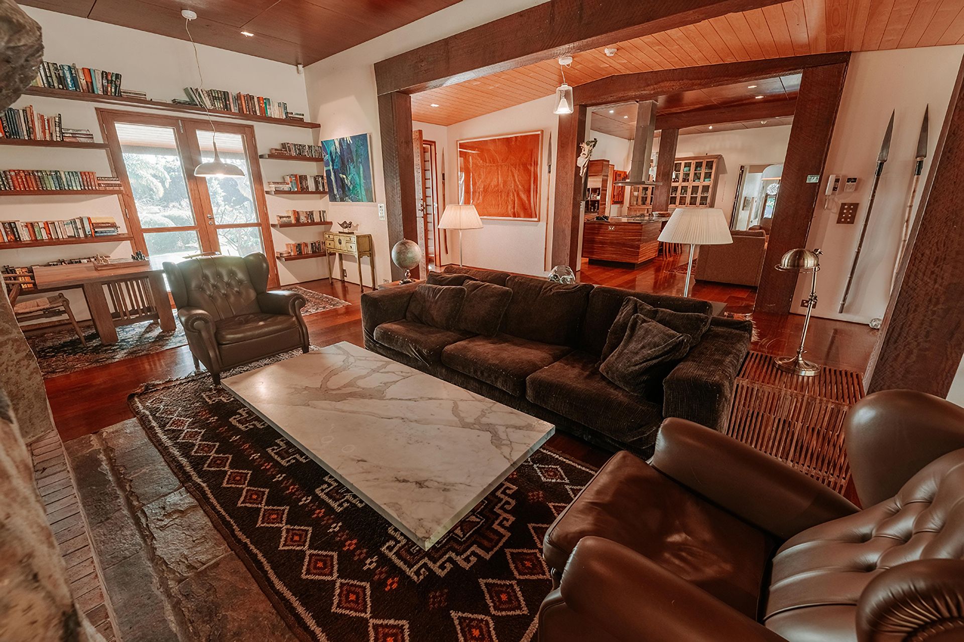 The second wing of the home is joined to the main house by an undercover wooden walkway. This space has a large comfortable living area with a double-sided fireplace, pool table, separate dining area, kitchen, a Queen en-suite bedroom, and a Japanese-style bunk room with 6 double beds - perfect for the kids!