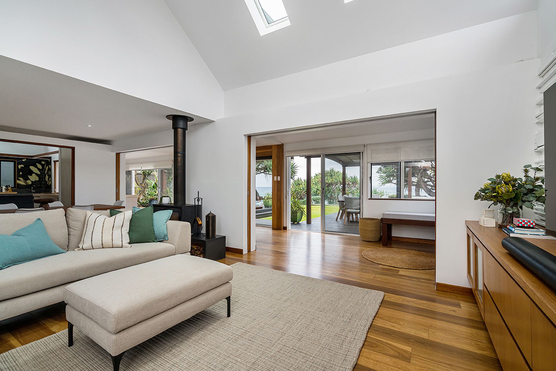 The main level has another two bedrooms each with their own bathroom. The kitchen and living areas are also on this level and expand out to the private alfresco dining with an in-built fire pit overlooking the ocean. There is exclusive beach access to take a dip and then enjoy the ocean view from the sun lounges