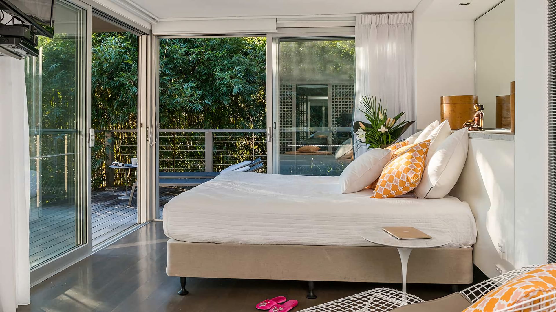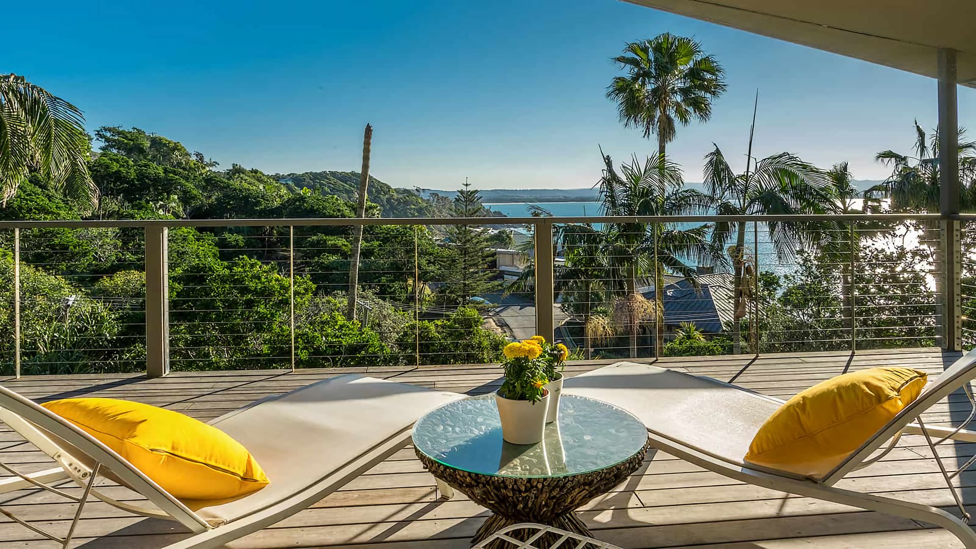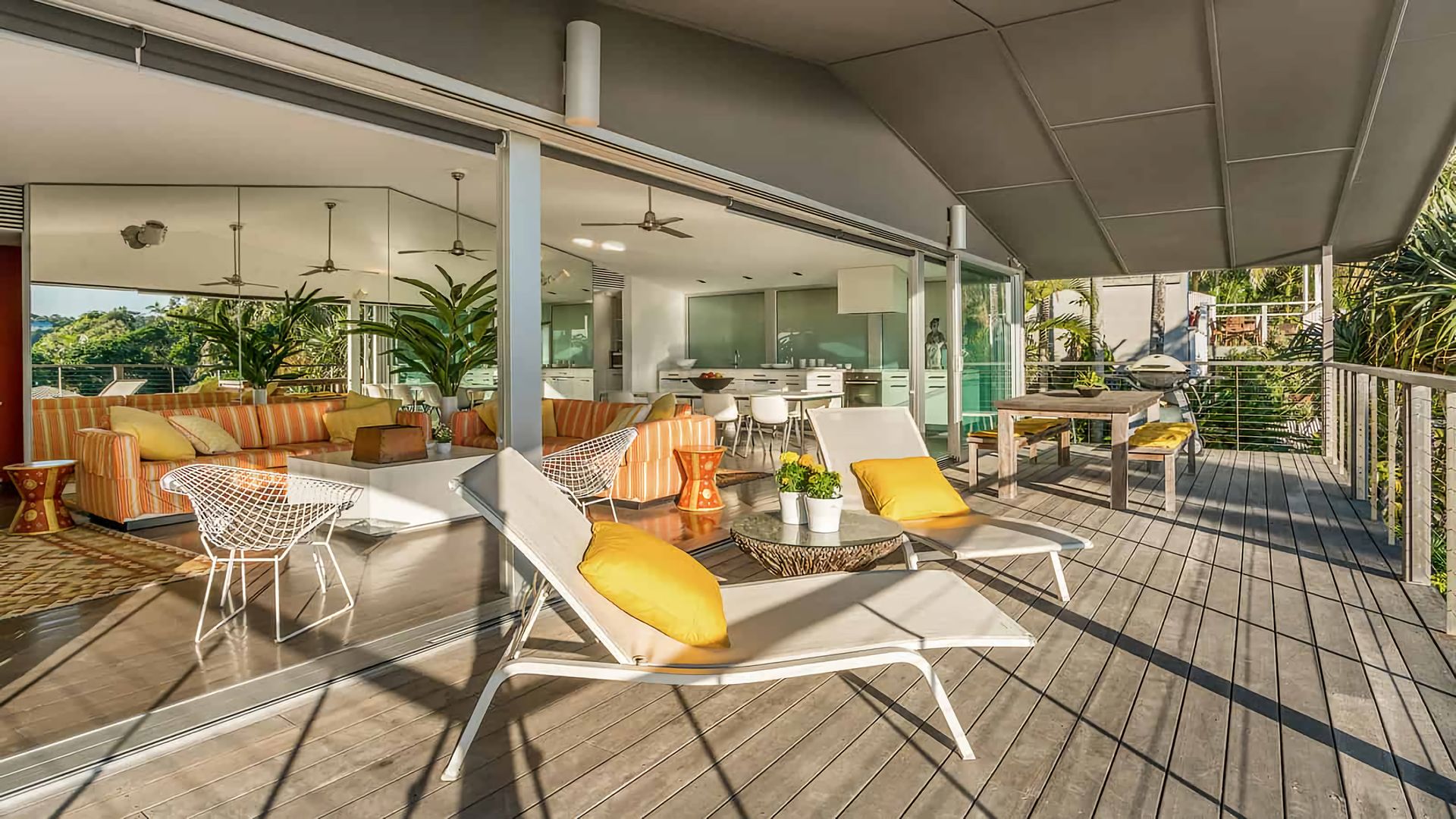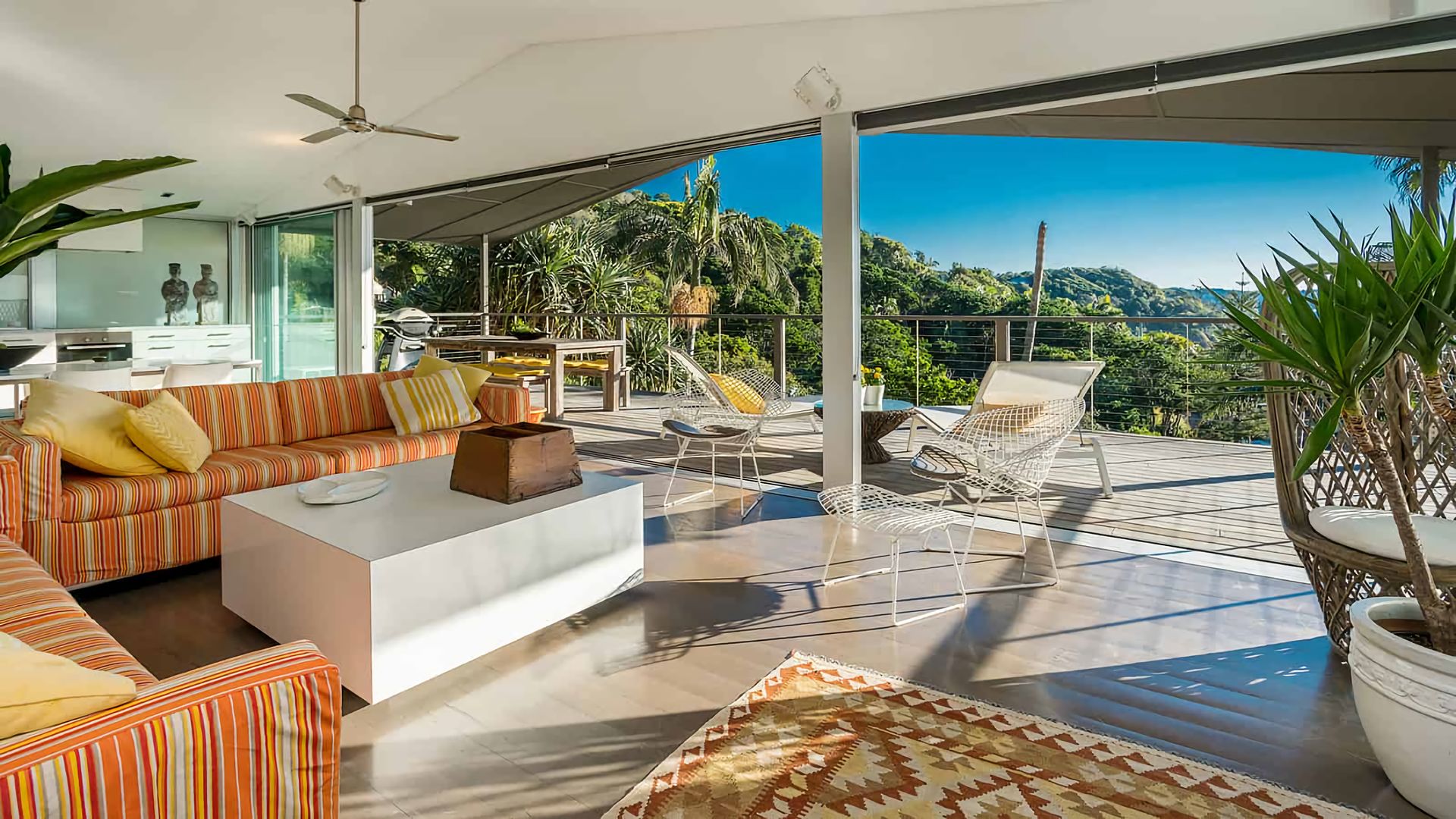 With four bedrooms, Byron Bay Villa will comfortably sleep up to eight guests between quality linen sheets in air-conditioned rooms. The powder room and oval European bath are crowned by domed skylights to disperse the abundant natural sunlight through the rooms. The spacious king-sized master bedroom with adjoining en-suite opens to a private deck that remains your little secret for as long as you choose to keep it.