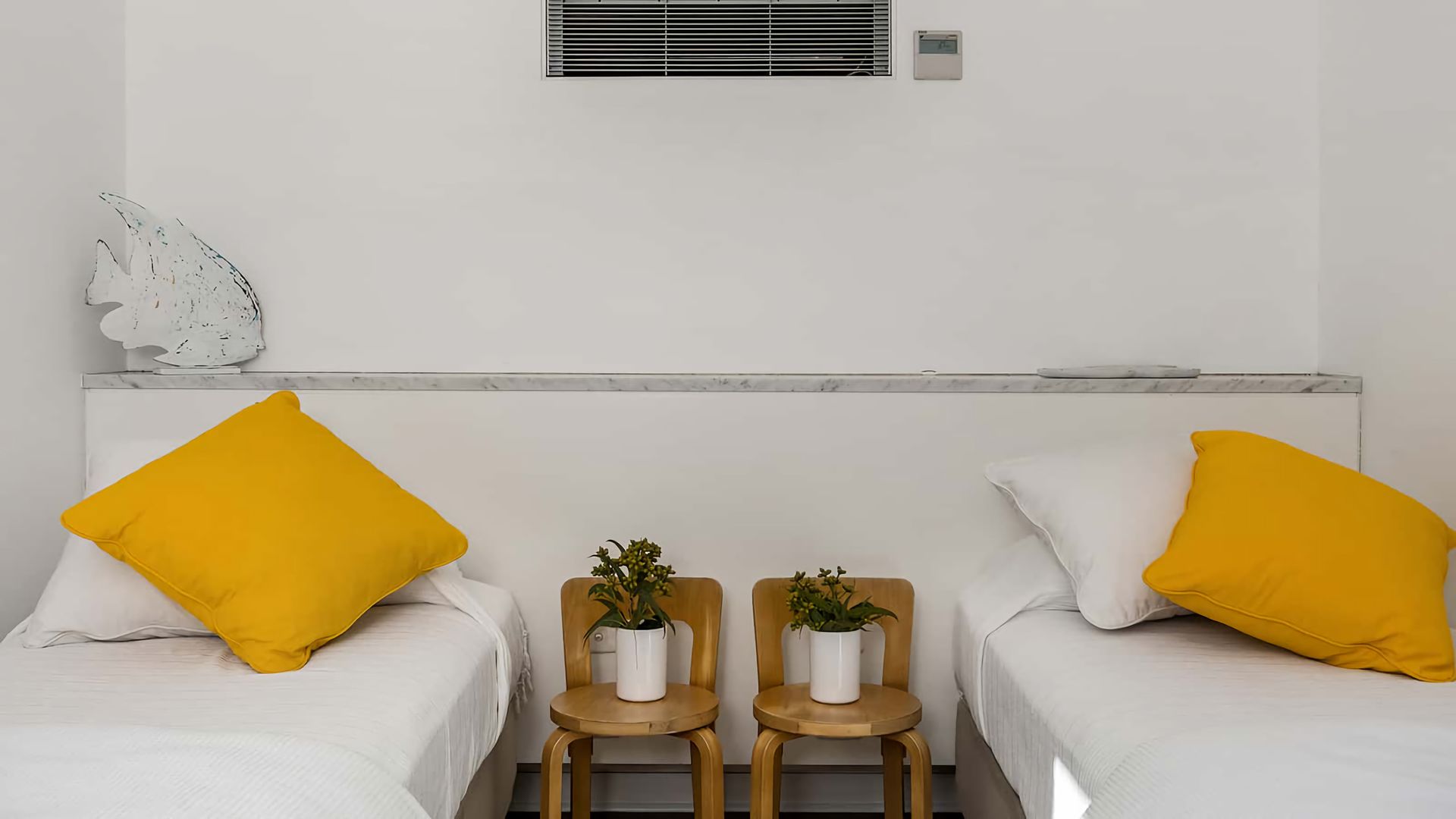 The living area sees Kenzo-upholstered sofas backed by a mirrored wall to ensure the sparkling ocean vista is reflected at all times, while a floating kitchen is kept clean and uncluttered by recessing amenities for a clean finish, fitting in with the rest of the household.