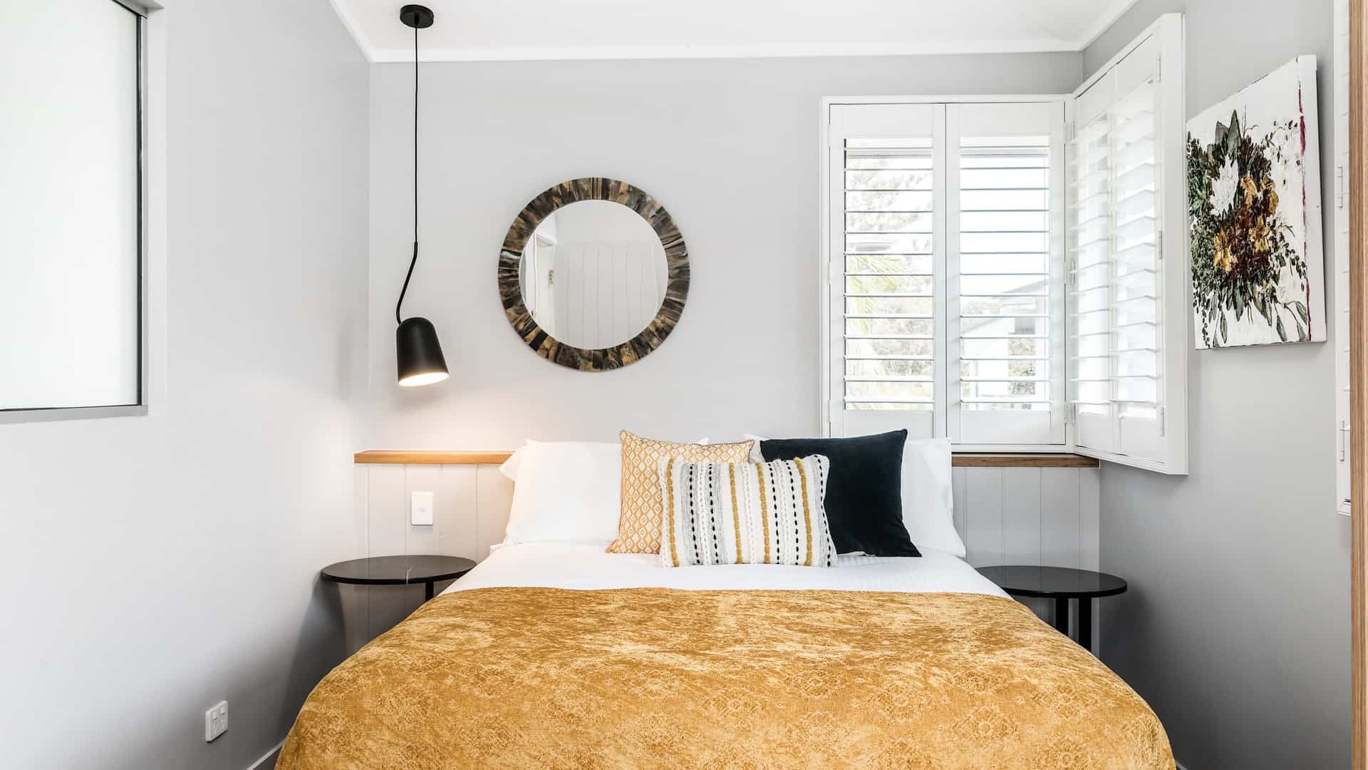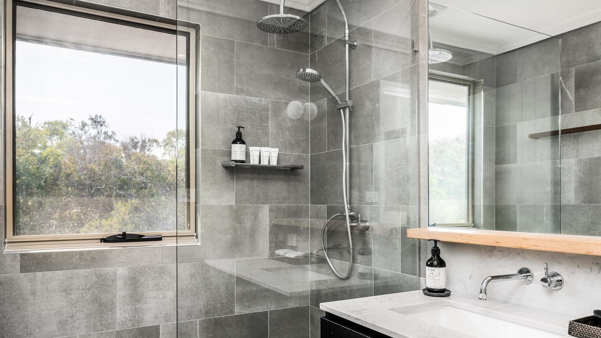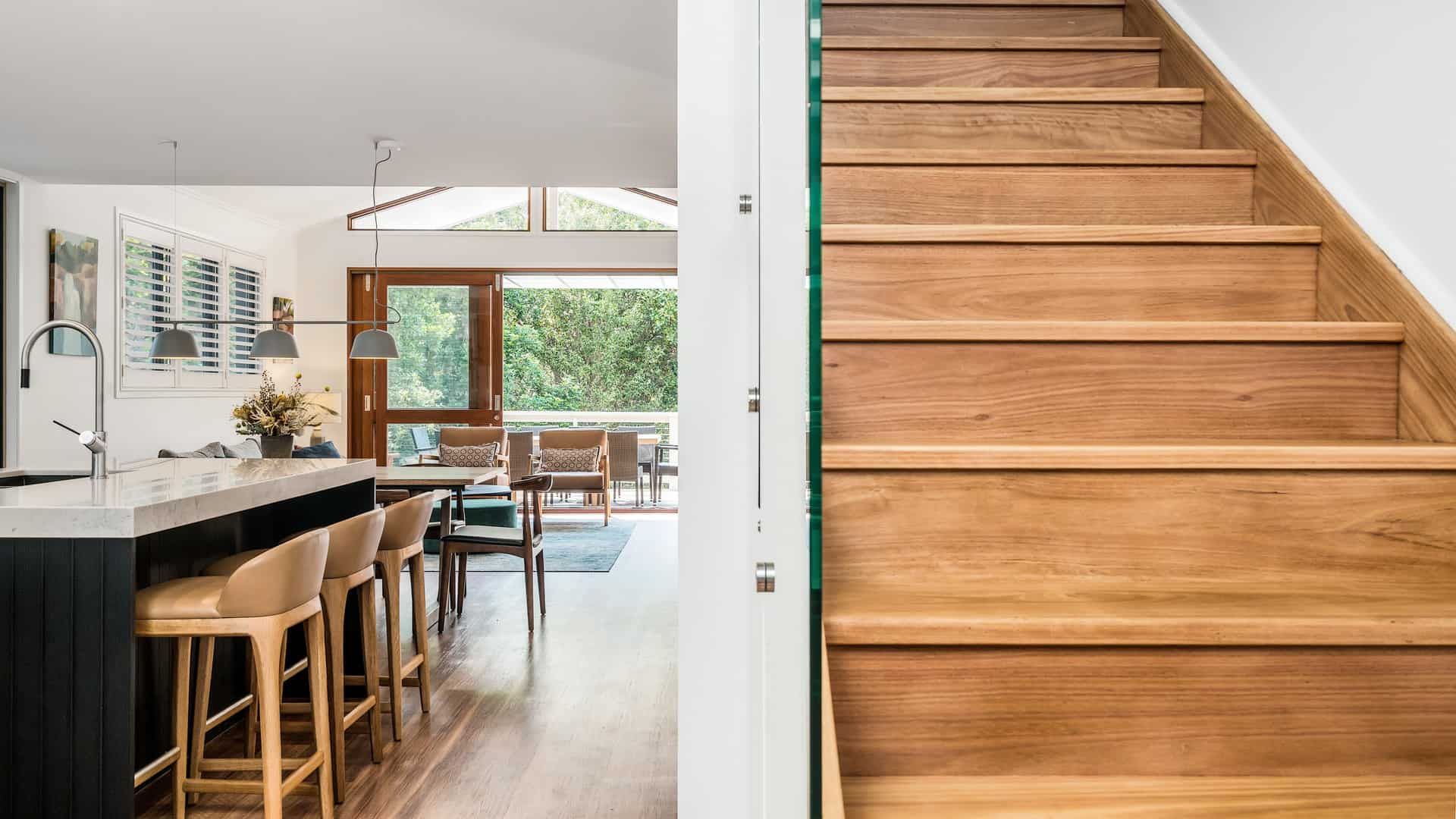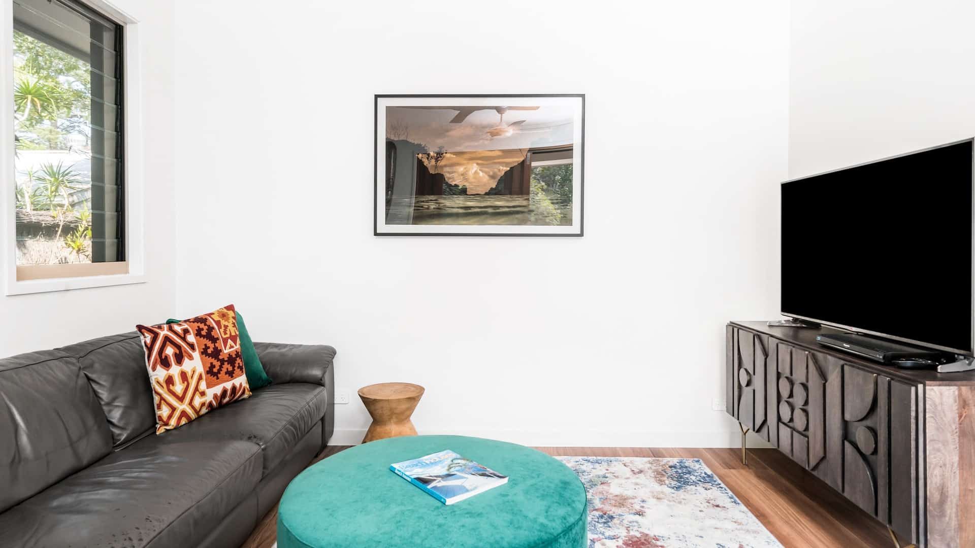 The house features four spacious bedrooms, three bathrooms and two powder rooms, comfortably accommodating up to eight guests. The house is set on two levels, with both living areas and kitchen and butlers pantry downstairs, as well as a large bedroom and ensuite. Upstairs there are another three bedrooms, king room with an ensuite bathroom, and a queen room and singles room sharing a bathroom.