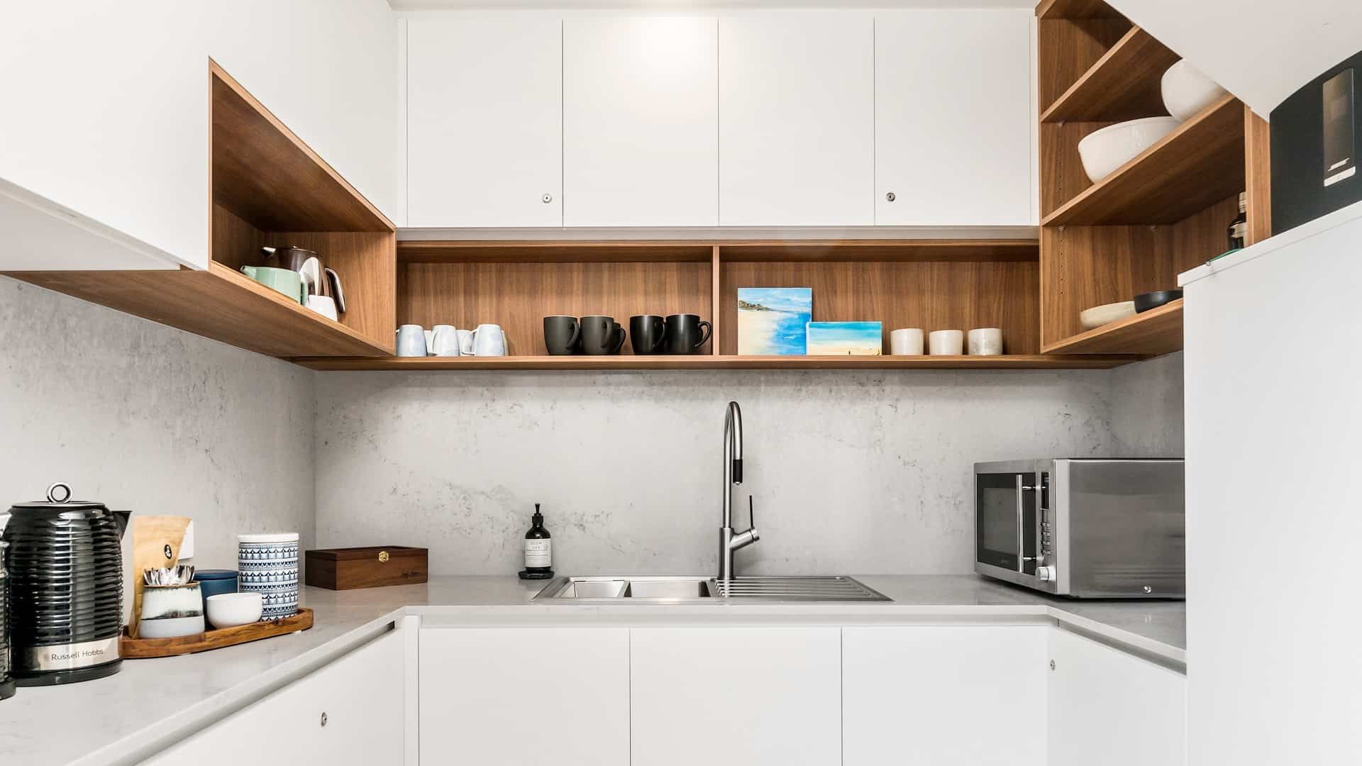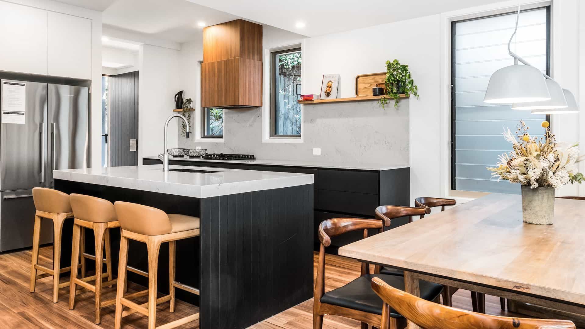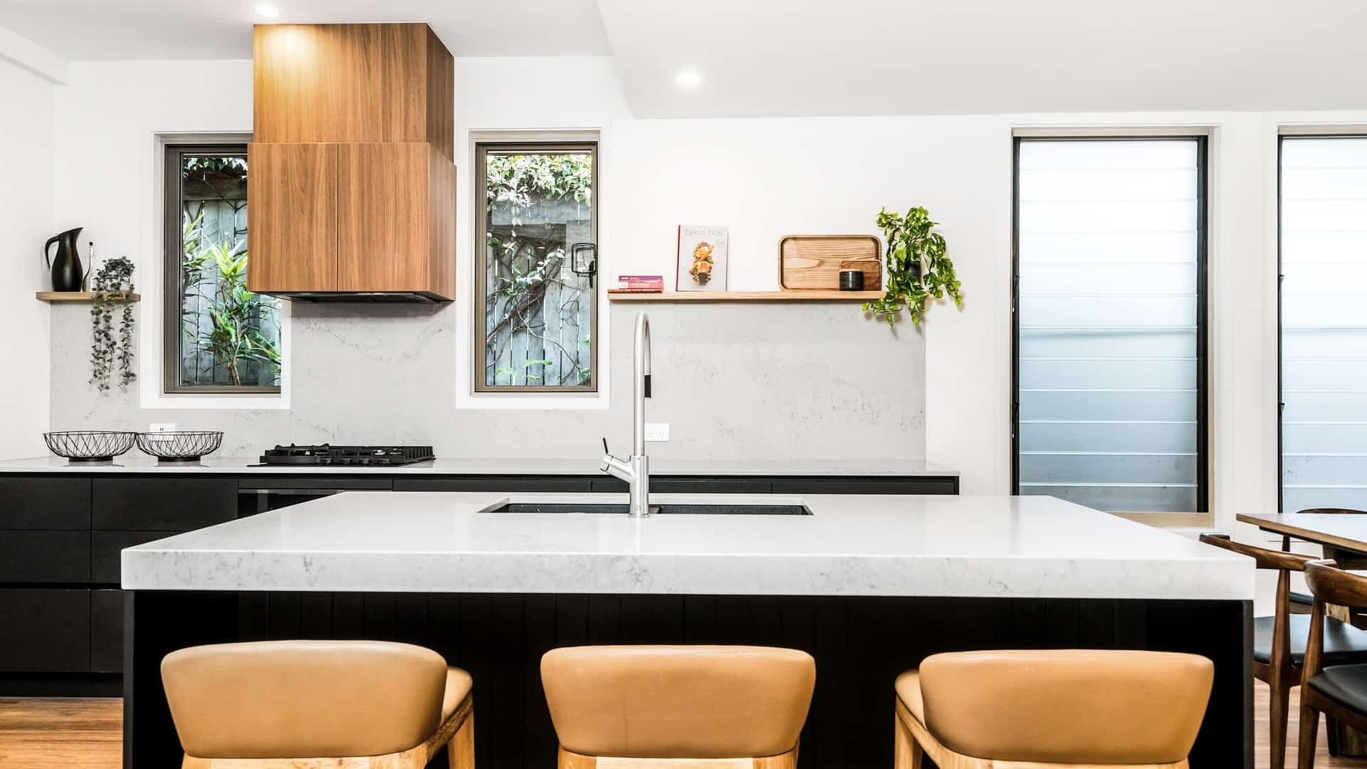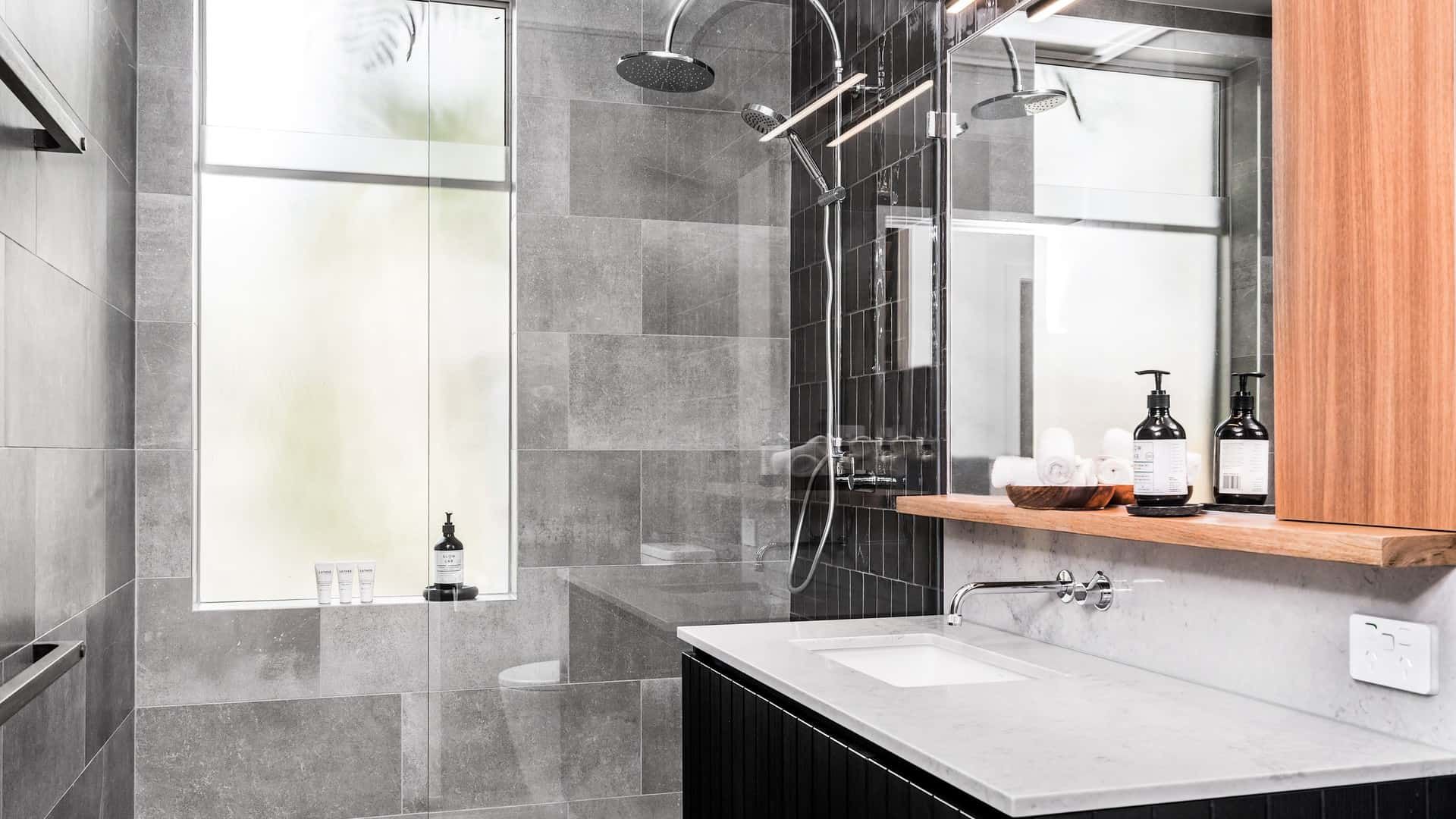 The house features four spacious bedrooms, three bathrooms and two powder rooms, comfortably accommodating up to eight guests. The house is set on two levels, with both living areas and kitchen and butlers pantry downstairs, as well as a large bedroom and ensuite. Upstairs there are another three bedrooms, king room with an ensuite bathroom, and a queen room and singles room sharing a bathroom.