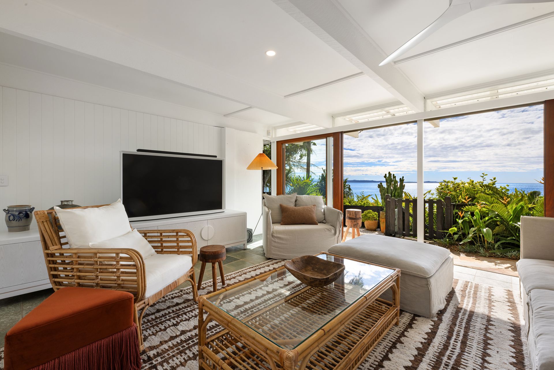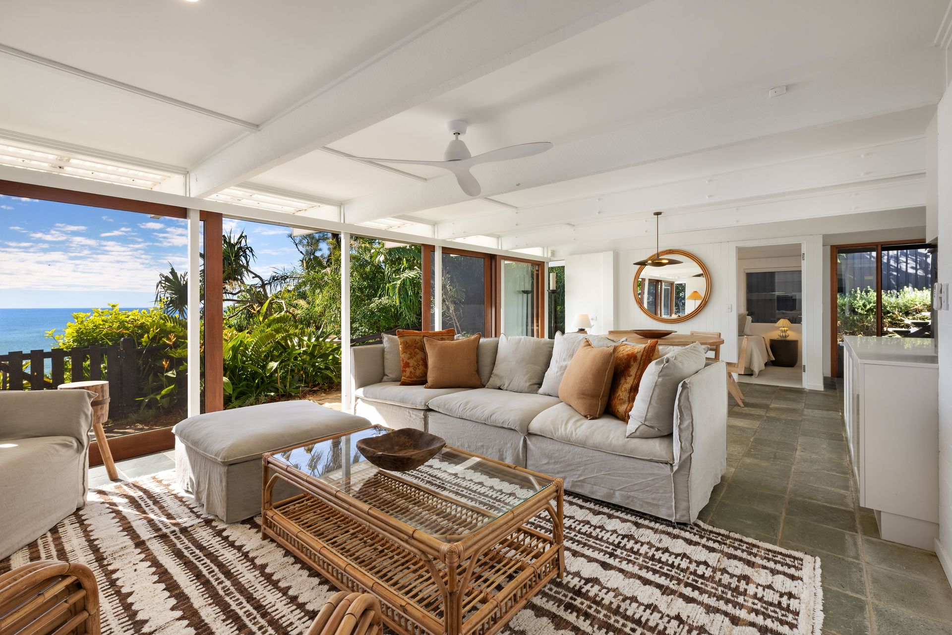 Enjoy seamless indoor-outdoor living with expansive sliding doors that open the home to ocean breezes and the sound of the surf. Watch dolphins, whales, and manta rays glide by from the comfort of the living area or while soaking up the sun in the private outdoor area. The generous outdoor entertaining area includes a dining setting and direct pathway access down to the beach, making it Easy access to Julian Place (and Wategos main beach) and walking track to Cape Byron Lighthouse