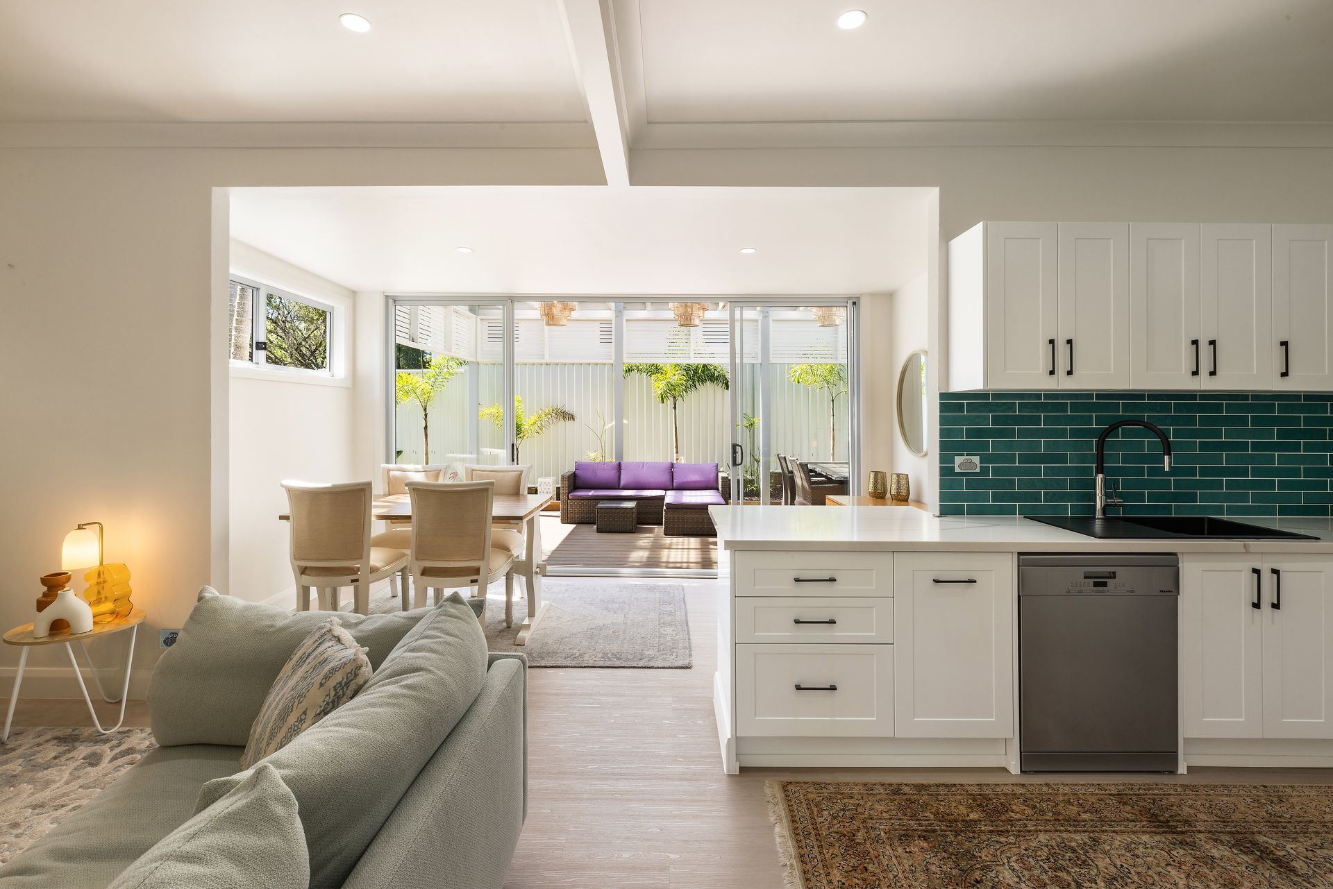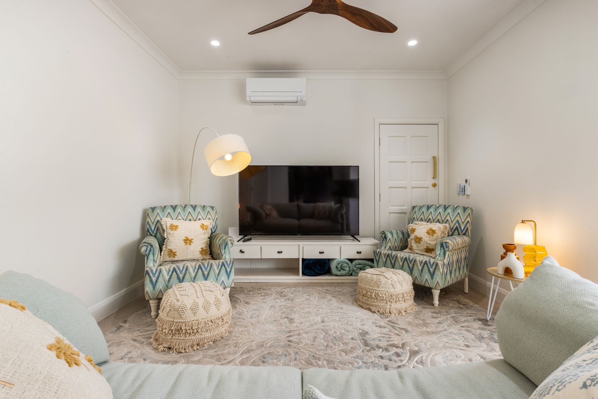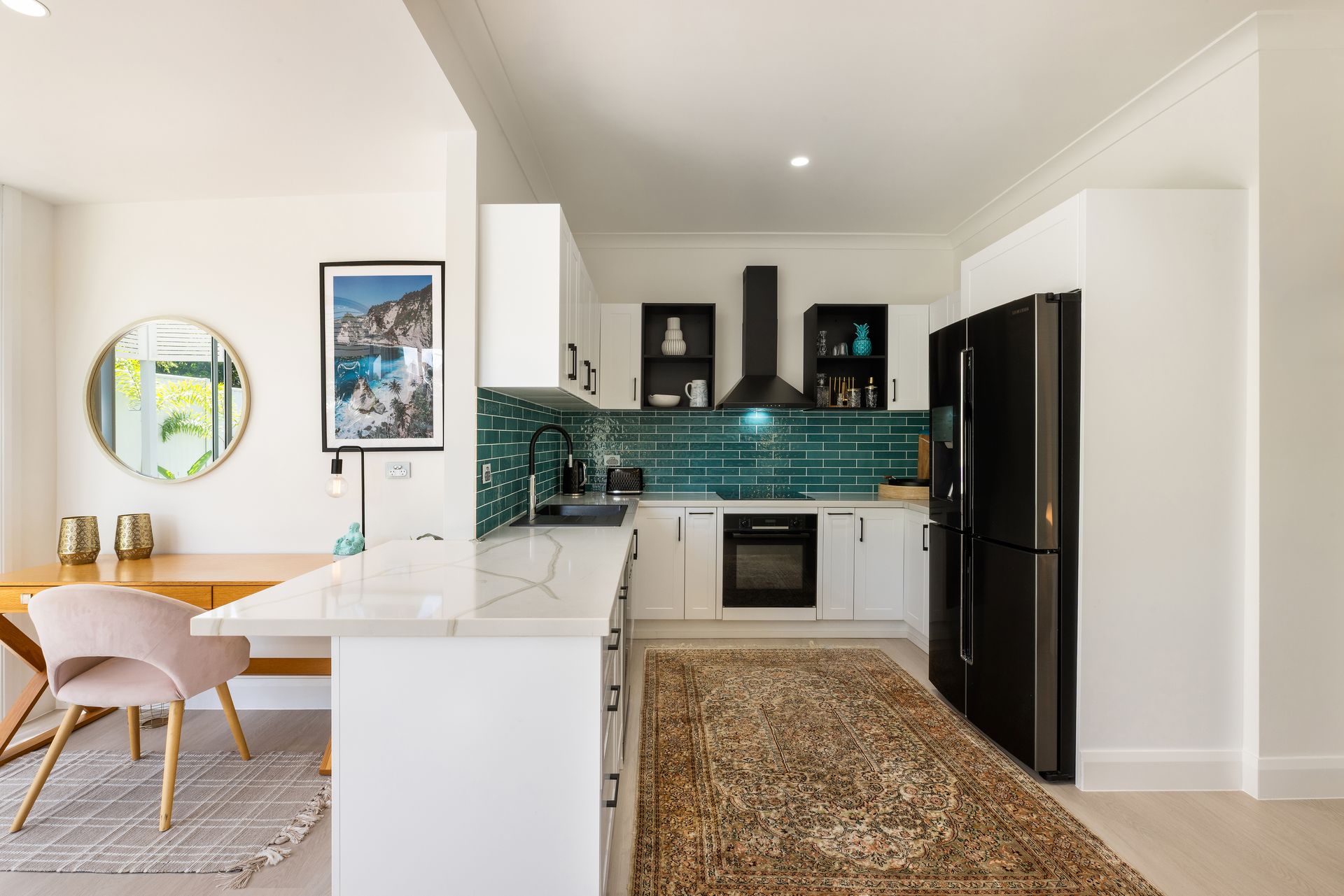 The light-filled kitchen is fully equipped with quality appliances, making it effortless to whip up snacks, shared meals, or sunset drinks before heading out. The open-plan living and dining area is bright and breezy, styled with coastal touches that make settling in feel instant. Slide open the doors to your private outdoor space — perfect for alfresco dining, morning coffees, or simply soaking up the Byron atmosphere.